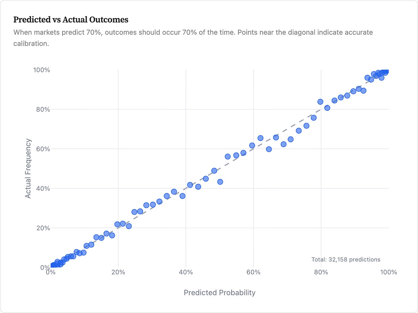 The good news: prediction markets are broadly predictive of political outcomes, as past research has found (including very recent work here and here). The figure below tests this directly: when the market says something has, say, a 70% chance of happening, does it actually happen about 70% of the time? For the most part, yes. The points cluster close to the line of perfect accuracy.