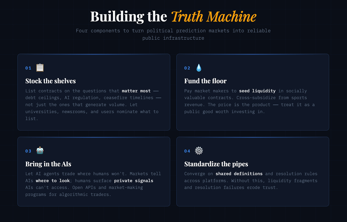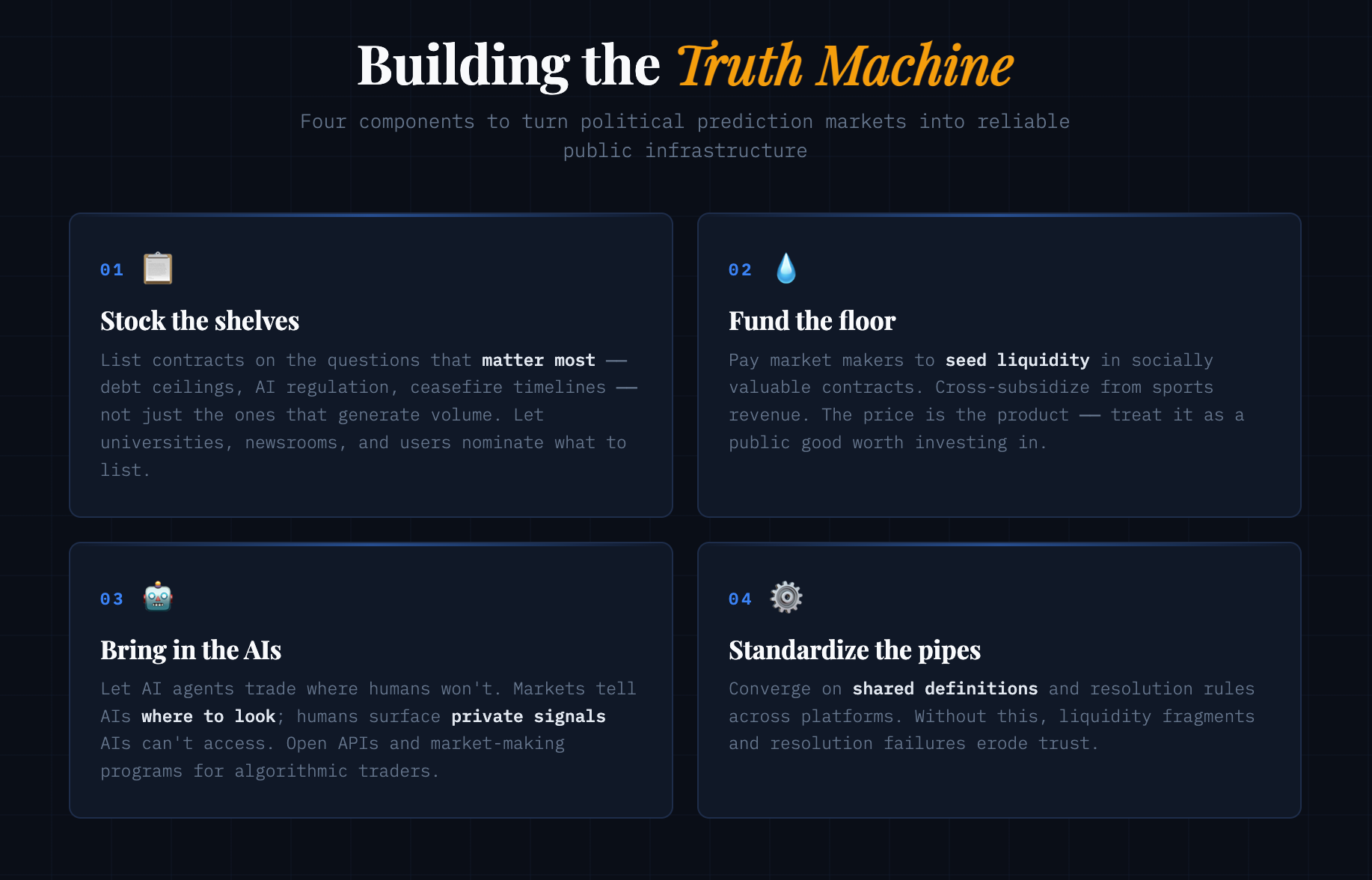 Building a truth machine requires four key components: questions worth answering, people willing to trade, intelligence capable of filling the gaps, and infrastructure reliable enough to trust. Right now, political prediction markets are missing most of these. Here’s how to fix that.