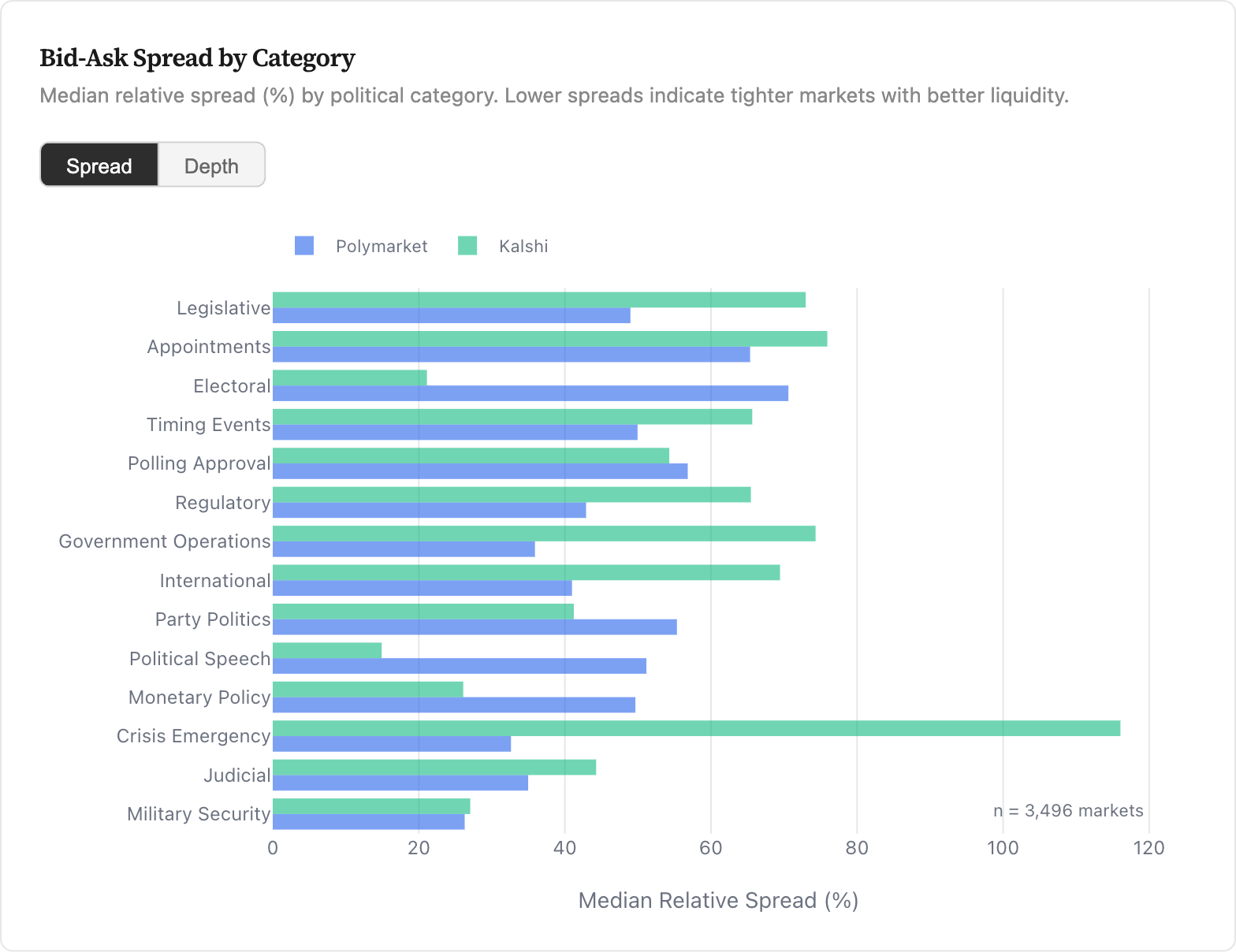 For the vast majority of political contracts, there’s almost no one on the other side of the trade. One way to see this: the gap between what buyers are willing to pay and what sellers are asking—a standard measure of how active a market is—typically exceeds 20% of the midpoint price, and is often much higher than that. That’s enormous. In a healthy, liquid market, that gap is no more than a few percentage points at most.