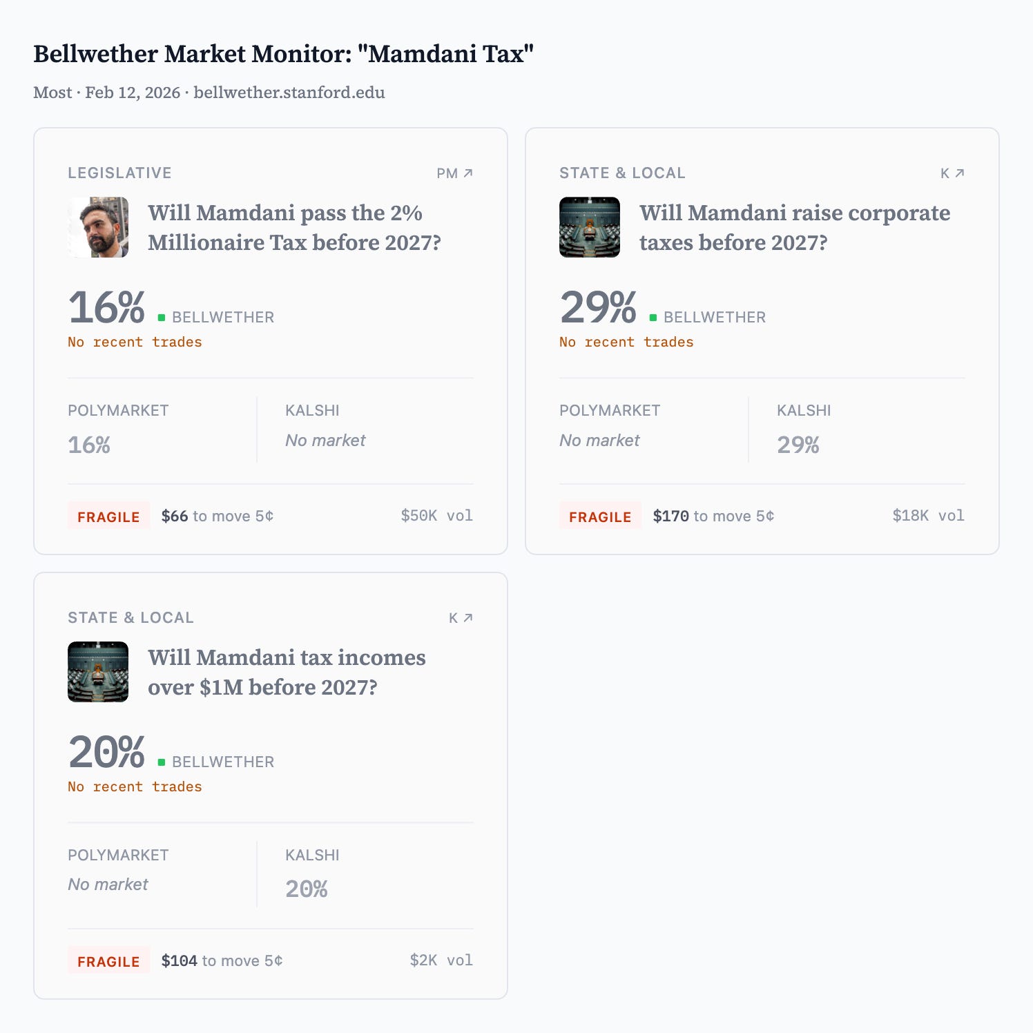 But can you? A Kalshi contract asks: “Will Mamdani raise corporate taxes before 2027?” It has less than $30,000 in total volume. A somewhat related though different Polymarket contract on the possibility of a millionaire tax has less than $50,000, almost no liquidity, and therefore no way for an informed trader to profitably participate.