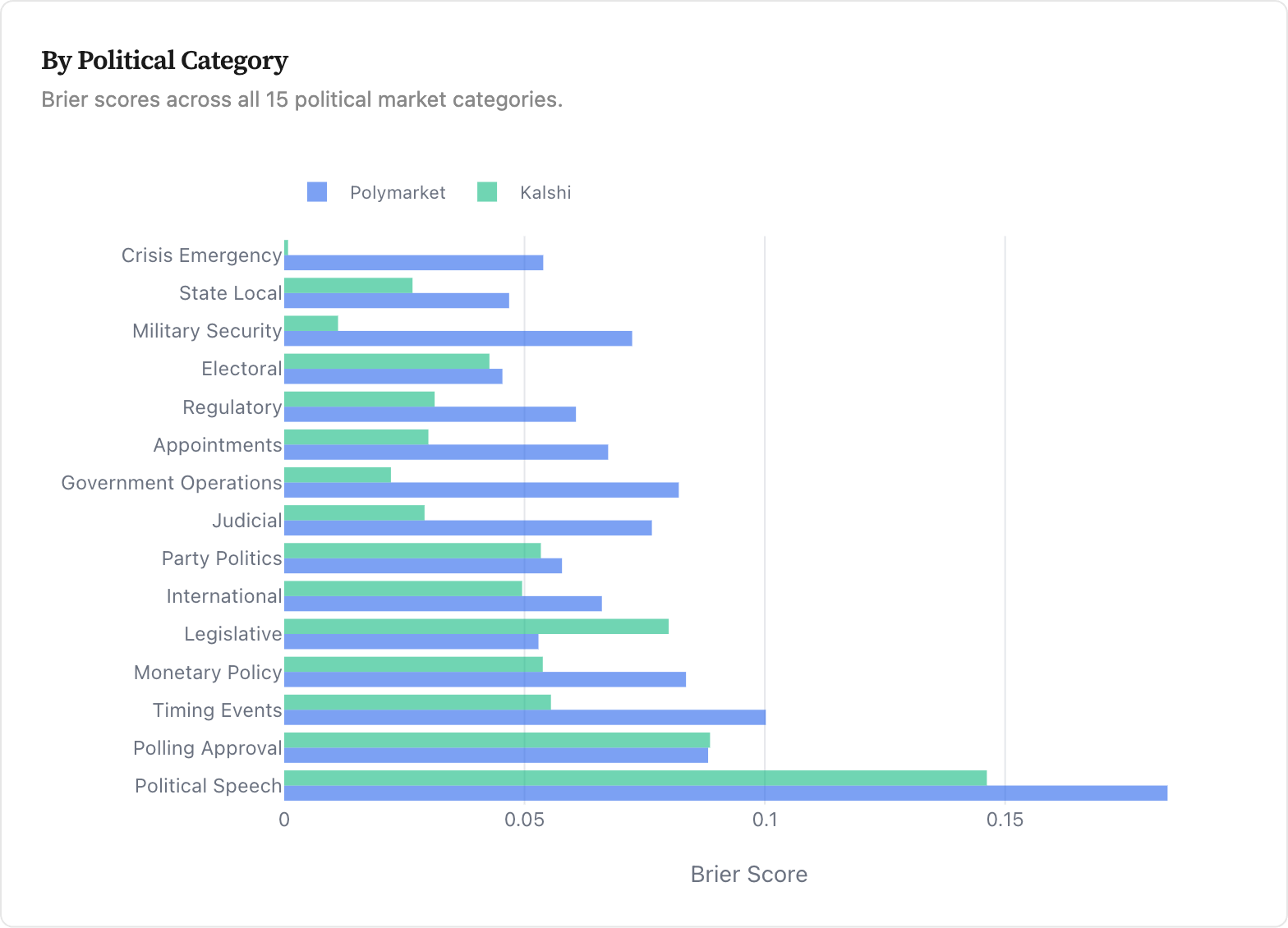 But this accuracy is uneven. The second chart breaks down how well Kalshi and Polymarket predict different types of political outcomes, using a standard accuracy measure, the Brier score (think of it like a golf score, where lower is better).