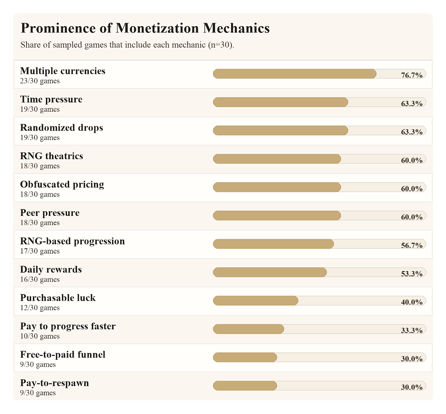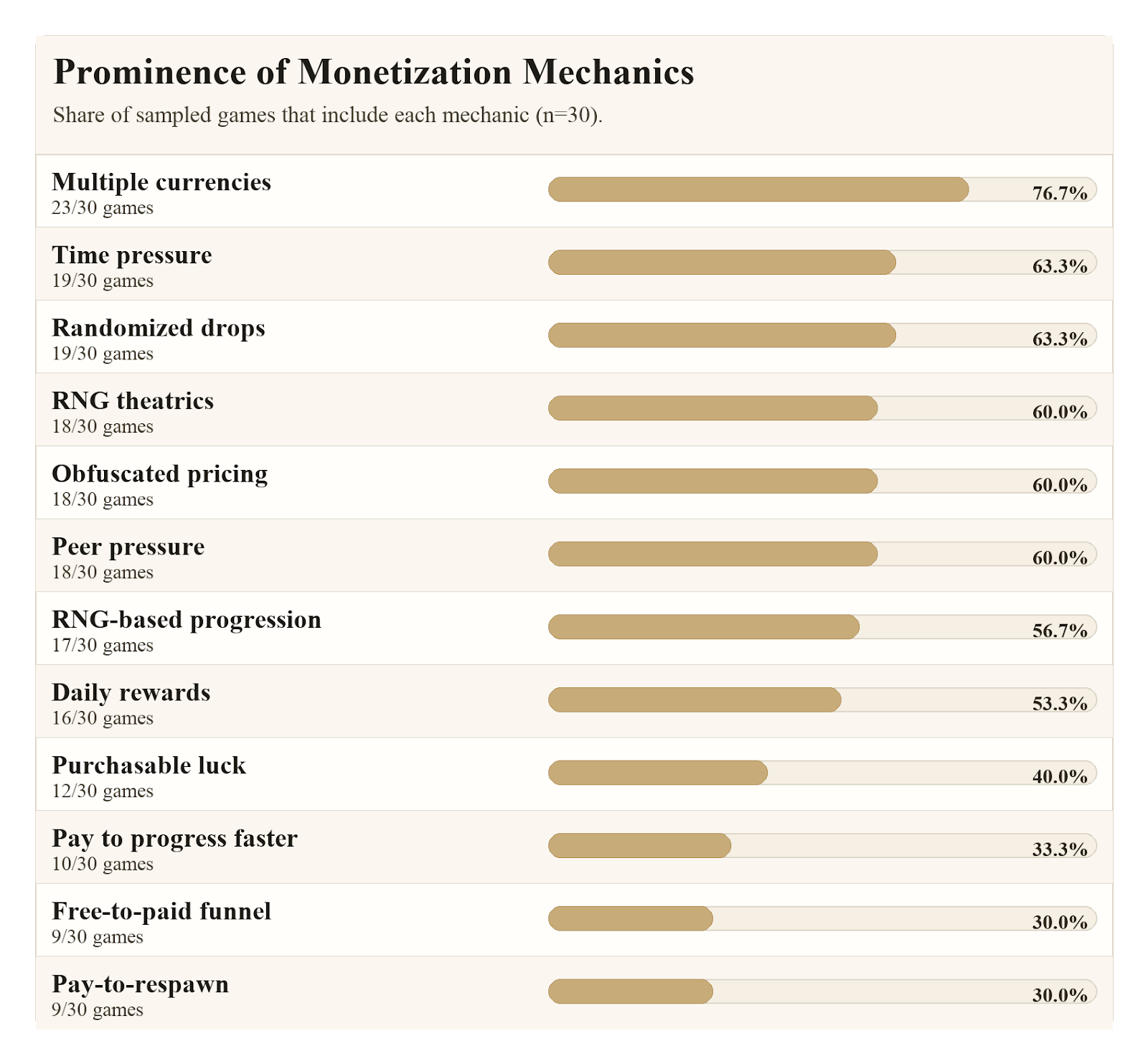 What emerged wasn’t a story about a few bad actors. The median game in our sample bundled eight of the twelve mechanics. Every game published in 2025 or later had at least five. The pattern is so consistent it looks less like individual developer choices and more like a template—an output of the platform’s own incentive architecture.