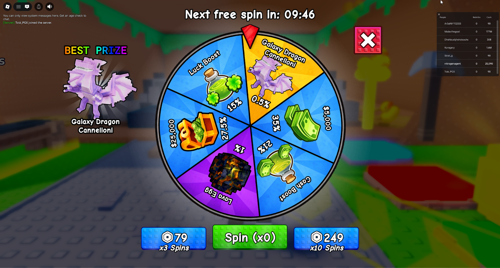 Next, the spin wheel, the most common recurring mechanic in our sample. In My Mining Brainrots, we earn a free spin every ten minutes! We can purchase spins individually, or in groups of 3 and 10. The “best prize” rotates – the value of which is unclear beyond belonging to the gold category and having the lowest odds. This is an example of trickling us with free samples of a paid mechanic in the hope we’ll return and spend more money.