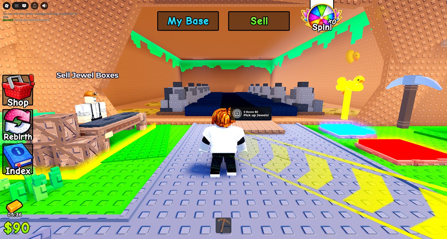 Before we even move our camera, we are presented with four opportunities to spend money. On our right, two rare pickaxes are shown, which speed up the intentionally slow gameplay loop of mining. Brainrot-adjacent games often depend on slow, boring mechanics which we naturally want to speed up, some even as mundane as waiting for an egg to crack or a crop to grow.