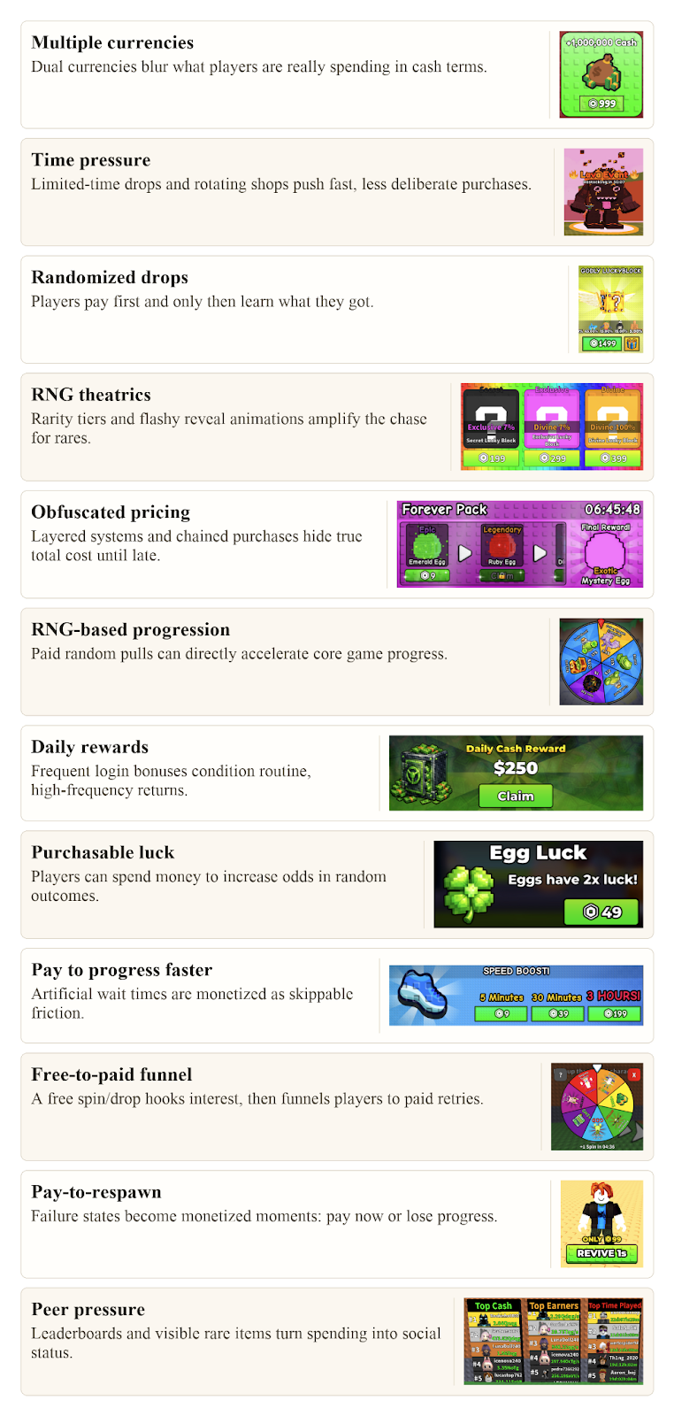 Inspired by this backdrop, we developed a taxonomy of twelve distinct gambling-like mechanics, sampled games from Roblox’s own trending charts, played through each one on a fresh account, and tagged every mechanic present within the first gameplay loop.