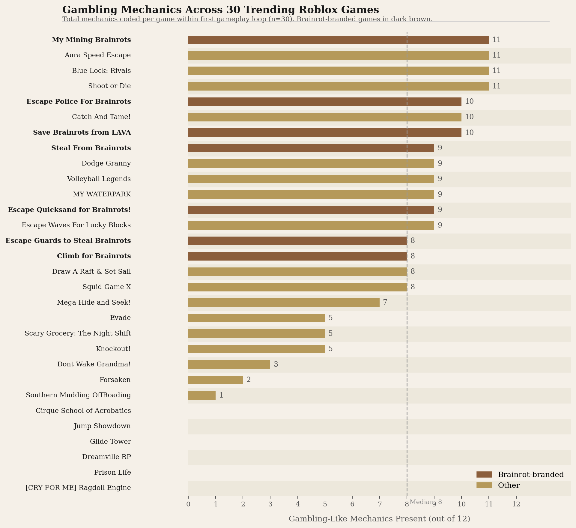 In our sample, games with brainrot branding had a median of nine mechanics. Games without it had a median of five.