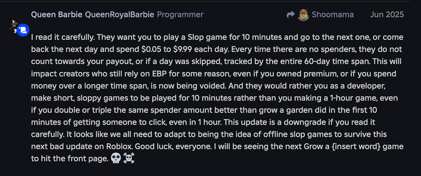 The conventional wisdom among Roblox developers right now seems to be that you need the existing stack—spin wheels, purchasable luck, offline earnings, chained purchases—to compete on the trending charts. To quote one developer, “They want developers to make games that exploit the attention of younger audiences by producing slop after slop.” No one has yet invested in testing that at scale.