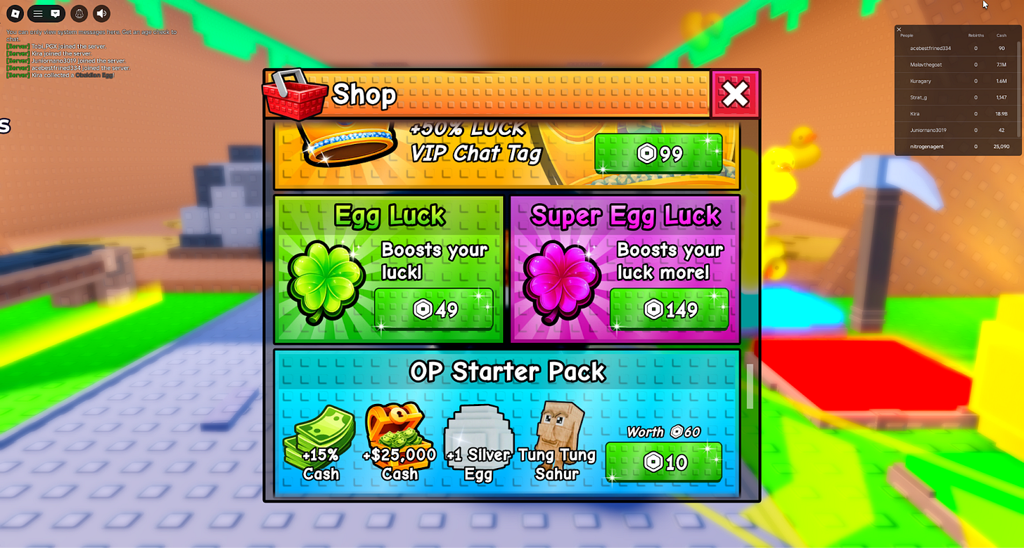 One recurring theme is the plethora of purchasables that make it difficult for an average player like us to compare values. Maybe it’s more effective to purchase cash outright in one of the game’s five Robux-for-cash bundles, but maybe it’s more effective to purchase Egg Luck and go for rare rolls, or buy the OP Starter Pack to unlock Tung Tung Sahur. This is further complicated by the several resources that can be bought, including spins, eggs, lucky boxes, cash, luck, and Robux.