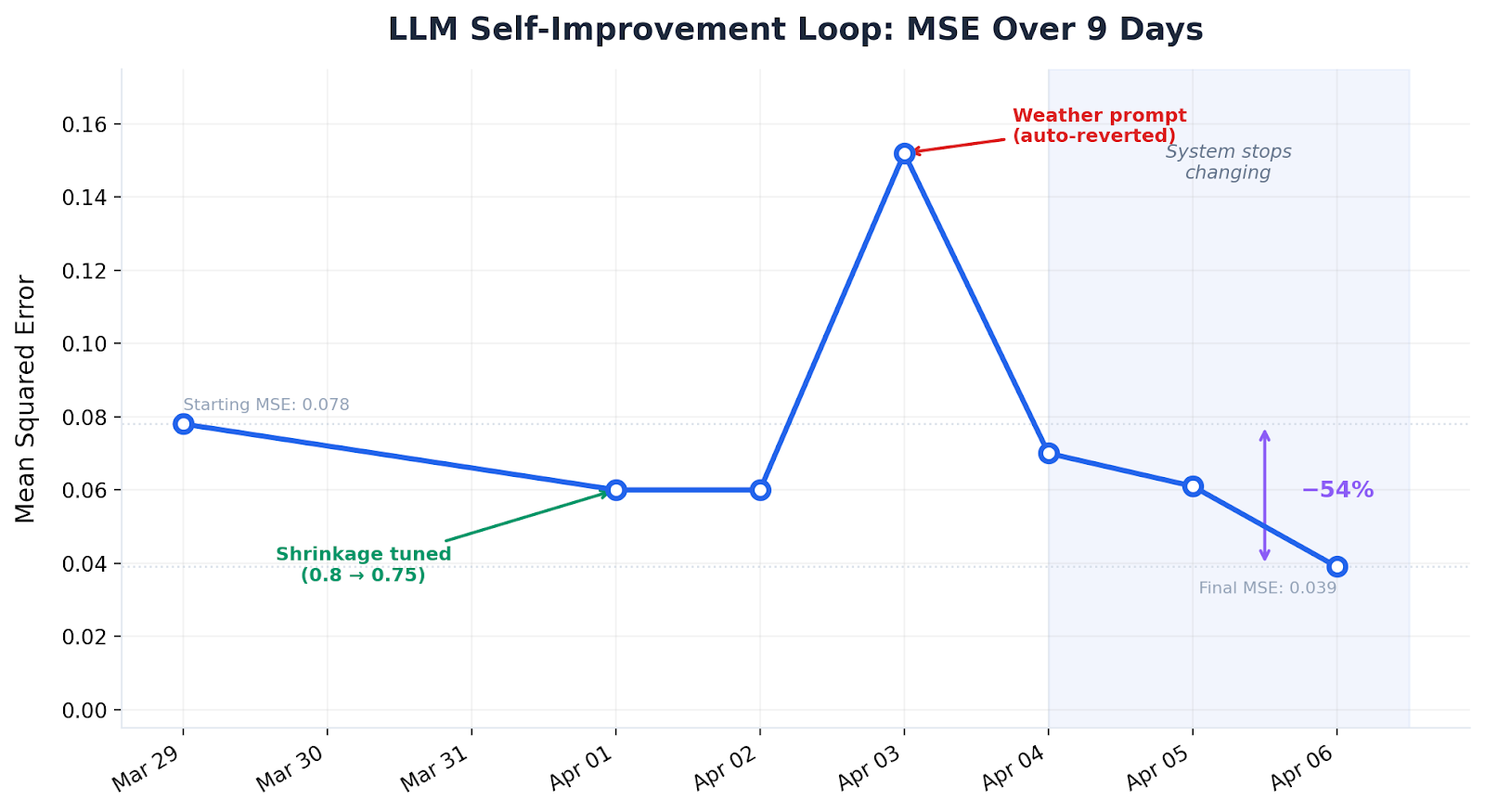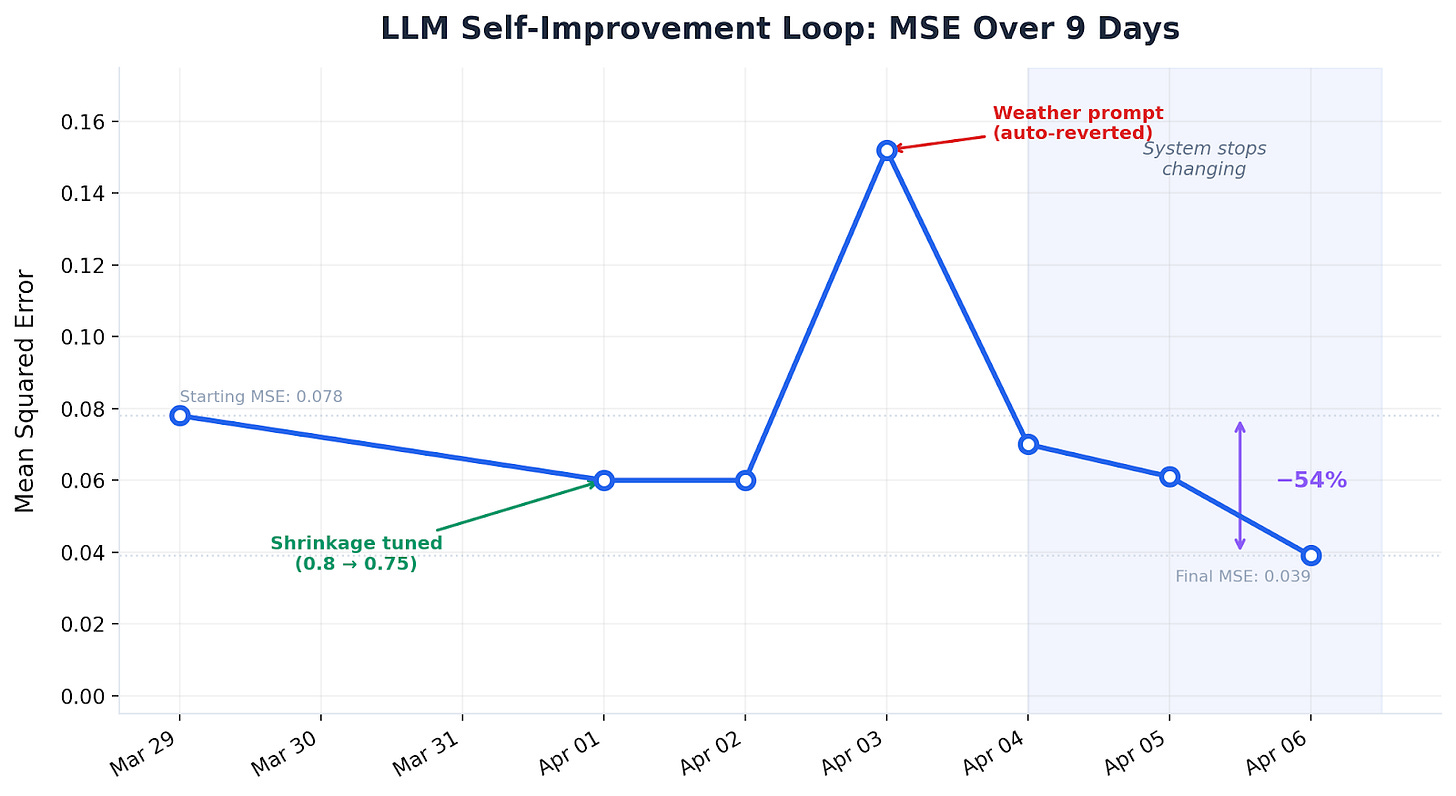 What we built and found: We had AI agents forecast 30+ contracts across categories — geopolitics and economics every 12 hours, sports and entertainment every 24 — pulling data from GDELT, Perplexity, Hyperliquid, and Polymarket’s order book. Each night, the agent reviews its scorecards and modifies its own forecasting code. Initial results show that it has improved its accuracy over time, but the bad news is that it’s done that by giving up. Every time the LLM has deviated from the market, it’s been wrong — so the self-improvement loop converges on copying the market price. This is a perfectly rational response and a complete dead-end, because a system that mirrors the market has zero forecasting value.