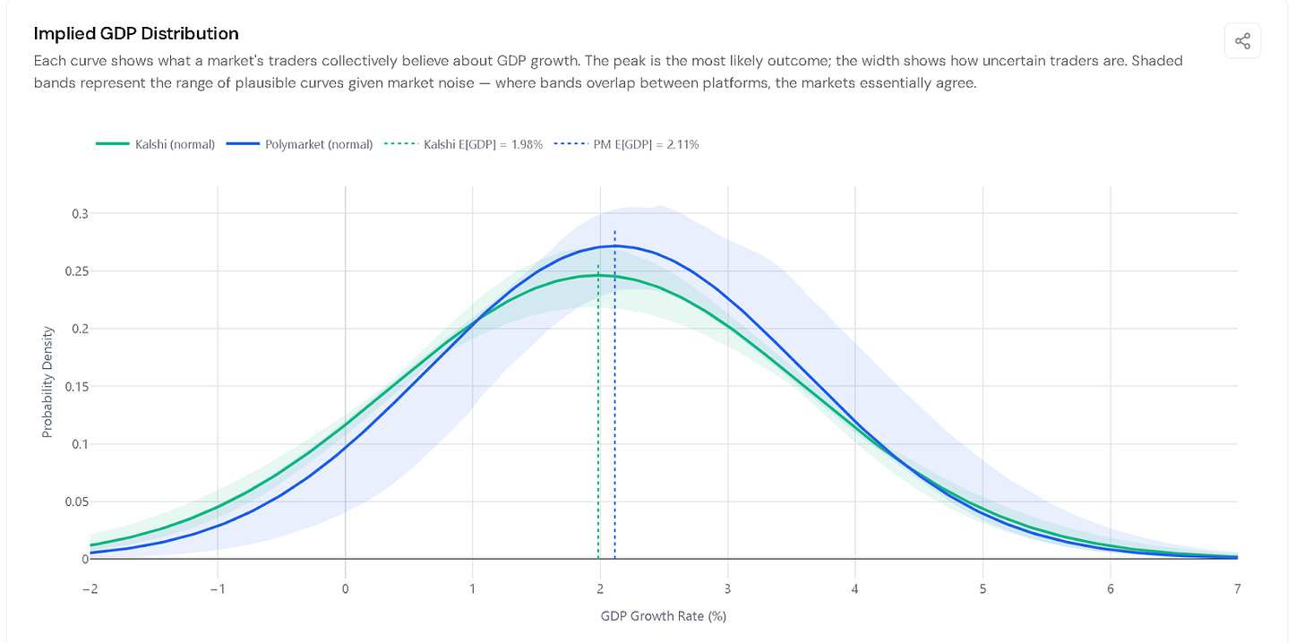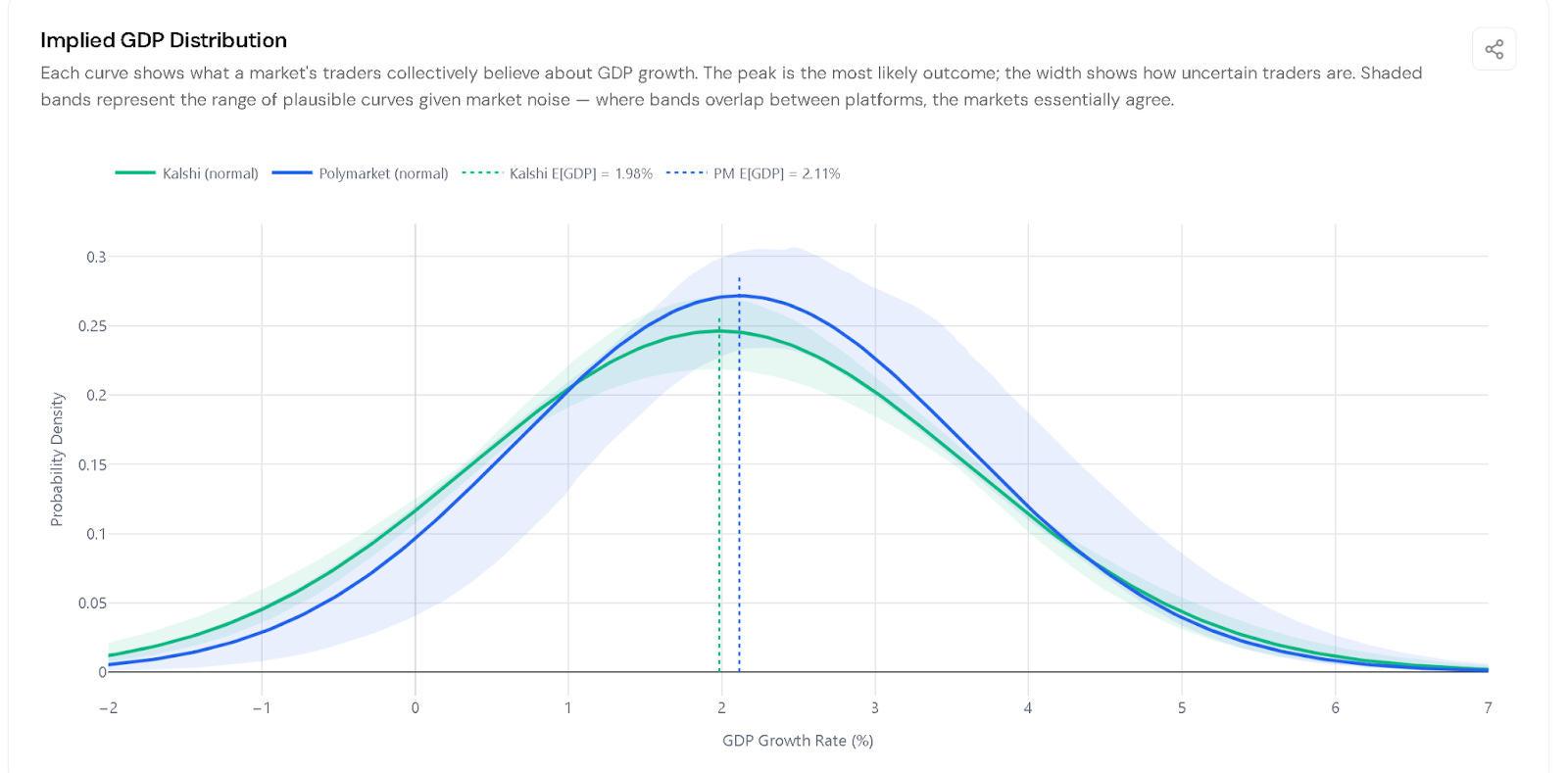 What we built and found: I’ve been helping to build Bellwether, a platform that pulls data from multiple prediction markets and puts it into a common format so you can actually compare them. The surprise: even for the cleanest possible contracts—GDP growth, inflation, Fed interest rate decisions—where the underlying number is fixed, the date is agreed upon, and there’s no ambiguity about the source, Kalshi and Polymarket structure their contracts so differently that they can’t be directly compared at all. Traders on each platform are technically betting on different questions about the same number. When I translated both platforms’ Q1 2026 GDP contracts into the same language, their implied forecasts were nearly identical—1.98% vs 2.11%. The markets essentially agreed. You just couldn’t tell, because the contracts were written differently