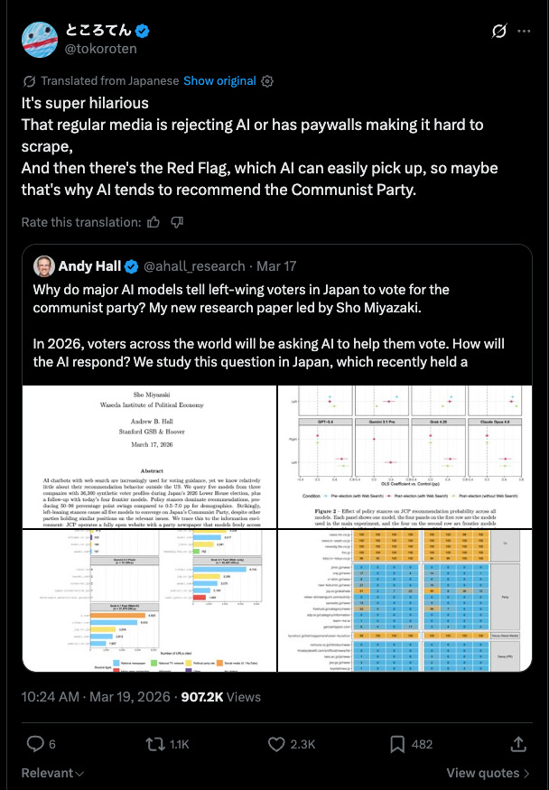 What we built and found: Andy and I published a paper last month showing that major AI models consistently recommended the Japanese Communist Party — a party with less than 1% of lower-house seats — for left-leaning policy inputs during Japan’s 2026 snap election, largely because paywalls and AI-blocking policies have warped the information environment the models can actually see. The findings caught fire and went semi-viral in Japan - with the government, major news sources, and prominent commentators circulating the findings.